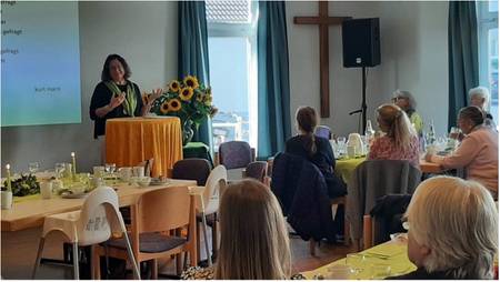 Der Gemeindesaal war festlich gedeckt, fast alle Plätze belegt und die Stimmung war sehr gut.Das Thema war: „Es ist nicht immer leicht, ich zu sein - vom guten Umgang mit sich selbst.“