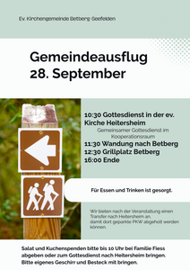 Wir starten mit dem gemeinsamen Gottesdienst im Kooperationsraum um 10:30 in Heitersheim. Danach wandern wir zum Grillplatz nach Betberg und werden bis ca. 16:00 dort sein.