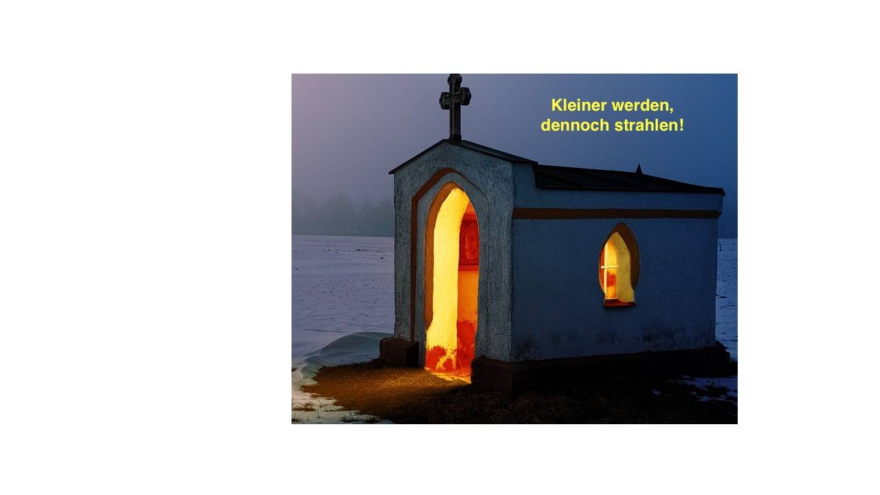 Dieser Satz könnte man als Überforderung oder zynischen Galgenhumor verstehen. Doch er ist ein Glaubenssatz, der aus einer biblischen Verheißung erwächst. Zur Illustration kann auf das Bild der kleinen Kapelle verwiesen werden, aus der helles Licht nach draußen dringt.